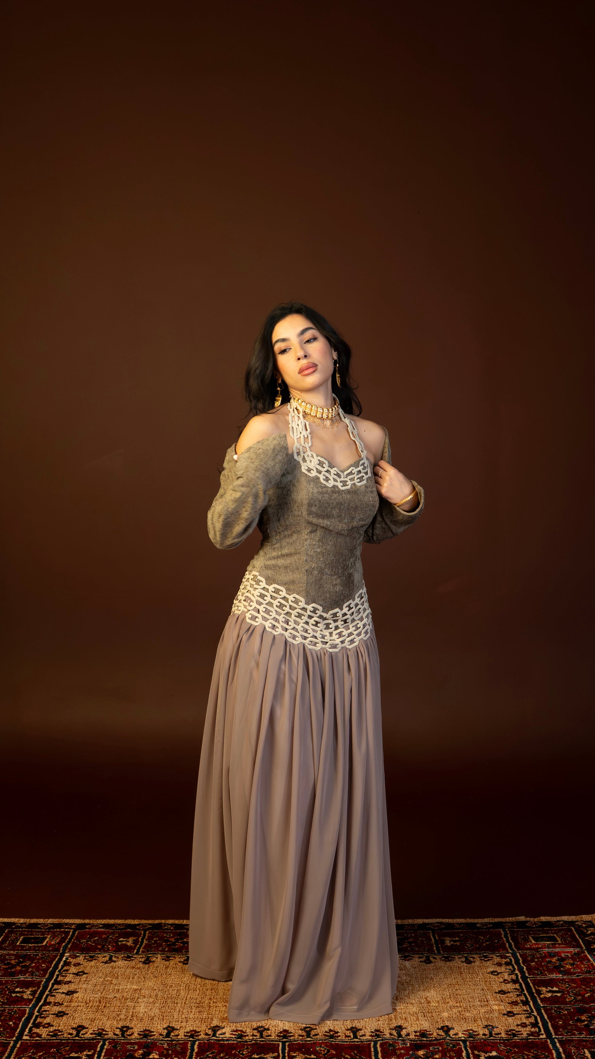 Address with upper cut that flows into a soft wide silhouette, featuring Long comfortable sleeves, and a waste detail that adds ease and movement